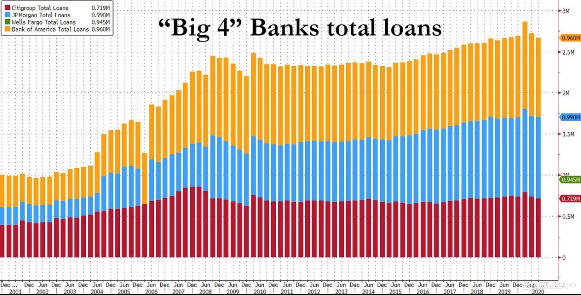 首先,观察摩根大通(JPM.US)、花旗银行(C.US)、美国银行(BAC.US)和富国银行(WFC.US)等4家大型银行,可以发现它们的贷款总额在第一季度的激增之后连续两个季度下降。