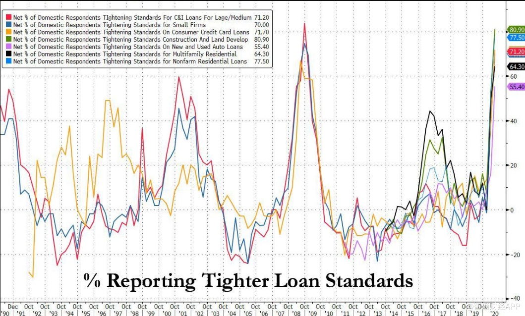 银行贷款标准最近飙升至金融危机以来所未见的水平,因此,贷款会随之下降并不奇怪。毕竟,银行仍对包括消费和投资、信用卡和汽车贷款、住宅和商业房地产在内的大多数垂直领域的贷款感到恐惧。