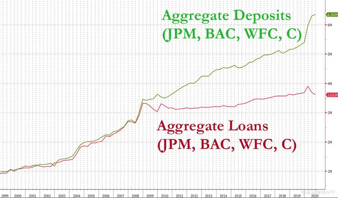 但是,为什么银行不增加放贷呢?毕竟,正如所有专家说的那样,贷款是刺激经济的主要途径之一。很简单,它不需要。正如上面的绿线所示,银行持有的消费者存款总额持续激增,达到创纪录的6.35万亿美元,本季度增加了500多亿美元,并将存款与贷款的差额推至2.7万亿美元的新纪录!存款已经足够多了,已经不需要银行通过放贷来创造存款。