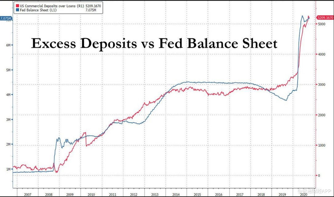 从图表中还可以很清楚地看到,当美联储实施量化宽松政策之后,红色和绿色线之间的缺口也开始扩大。下一张美国商业银行体系内过剩存款与美联储资产负债表的对比图表,相当清楚地显示出正在发生的事情。