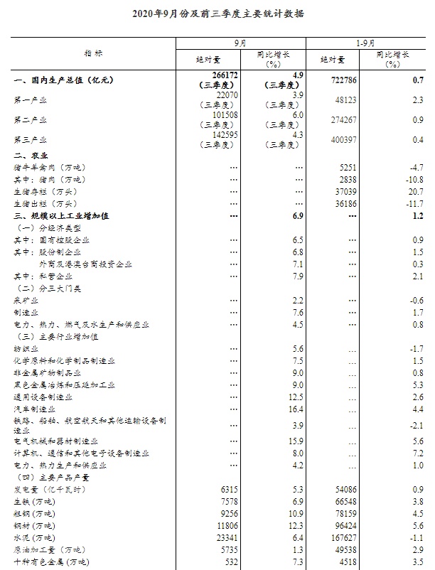 智通财经APP获悉,今日(10月19日),国家统计局发布数据,前三季度经济增速由负转正,供需关系逐步改善,市场活力动力增强,就业民生较好保障,国民经济延续稳定恢复态势,社会大局保持稳定。