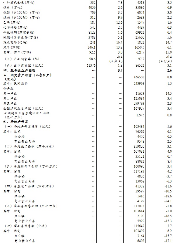 前三季度,全国固定资产投资(不含农户)436530亿元,同比增长0.8%,增速年内首次由负转正,上半年为下降3.1%。分领域看,基础设施投资增长0.2%,增速年内首次由负转正,上半年为下降2.7%;制造业投资下降6.5%,降幅比上半年收窄5.2个百分点;房地产开发投资增长5.6%,增速比上半年提高3.7个百分点。全国商品房销售面积117073万平方米,下降1.8%,降幅比上半年收窄6.6个百分点;商品房销售额115647亿元,增长3.7%,上半年为下降5.4%。分产业看,第一产业投资增长14.5%,增速比上半年提高10.7个百分点;第二产业投资下降3.4%,降幅比上半年收窄4.9个百分点;第三产业投资增长2.3%,上半年为下降1.0%。民间投资243998亿元,下降1.5%,降幅比上半年收窄5.8个百分点。高技术产业投资增长9.1%,增速比上半年提高2.8个百分点;其中高技术制造业和高技术服务业投资分别增长9.3%和8.7%。高技术制造业中,医药制造业、计算机及办公设备制造业投资分别增长21.2%、9.3%;高技术服务业中,电子商务服务业、信息服务业、科技成果转化服务业投资分别增长20.4%、16.9%、16.8%。社会领域投资增长9.2%,增速比上半年提高3.9个百分点;其中卫生、教育投资分别增长20.3%、12.7%,增速分别比上半年提高5.1、1.9个百分点。从环比看,9月份固定资产投资(不含农户)比上月增长3.37%。