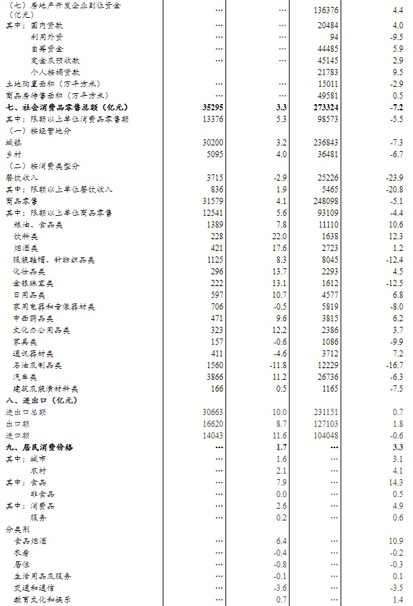 前三季度,社会消费品零售总额273324亿元,同比下降7.2%,降幅比上半年收窄4.2个百分点;其中三季度增长0.9%,季度增速年内首次转正。9月份,社会消费品零售总额35295亿元,同比增长3.3%,增速比8月份加快2.8个百分点,连续2个月增长。前三季度,按经营单位所在地分,城镇消费品零售额236843亿元,下降7.3%;乡村消费品零售额36481亿元,下降6.7%。按消费类型分,餐饮收入25226亿元,下降23.9%;商品零售248098亿元,下降5.1%。消费升级类商品销售较快增长,通讯器材类、体育娱乐用品类、化妆品类商品零售额分别增长7.2%、6.8%、4.5%。前三季度全国网上零售额80065亿元,同比增长9.7%,增速比上半年加快2.4个百分点。其中,实物商品网上零售额66477亿元,增长15.3%,占社会消费品零售总额的比重为24.3%。