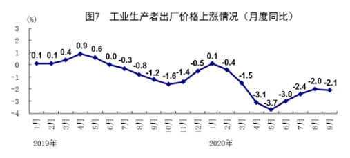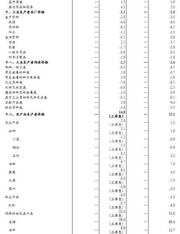 前三季度,全国工业生产者出厂价格同比下降2.0%;其中9月份同比下降2.1%,环比上涨0.1%。前三季度,全国工业生产者购进价格同比下降2.6%;其中9月份同比下降2.3%,环比上涨0.4%。