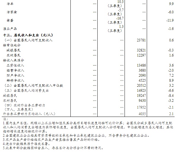 前三季度,全国居民人均可支配收入23781元,同比名义增长3.9%,扣除价格因素实际增长0.6%,年内首次转正,上半年为下降1.3%。按常住地分,城镇居民人均可支配收入32821元,名义增长2.8%,实际下降0.3%;农村居民人均可支配收入12297元,名义增长5.8%,实际增长1.6%。城乡居民人均可支配收入比值为2.67,比上年同期缩小0.08。全国居民人均可支配收入中位数20512元,同比名义增长3.2%。