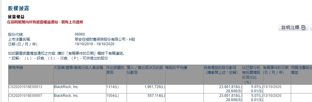 贝莱德持有众安在线(06060)2380万股,持股比例超5%