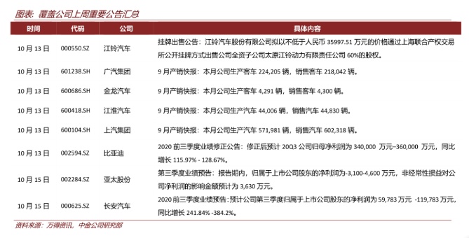 新能源、重卡有望维持较高景气度。9月,新能源汽车产销分别完成13.6万辆和13.8万辆,同比分别增长48.0%和67.7%,产销数据刷新了9月历史记录。其中,BEV销量11.2万辆,同比增长71.5%;PHEV销量2.6万辆,同比增长53.9%。分车型看,五菱mini EV带动A00级销量至3.3万辆,渗透率提升至24%;特斯拉、比亚迪汉、理想、蔚来等高端车型的合计市场份额亦超过2成,新能源车市两端发力态势明显。9月,客车销量同比转正,货车保持强势。其中,重卡销量15.1万辆,同比+80.2%,我们对9月环比转正的预判得到验证。我们认为,10月行业实际需求仍有望环比维持,工程重卡需求有望继续环比增长。4Q行业高景气有望维持,不考虑“开门红”等调节因素影响,全年重卡行业实际需求量或将超165万辆。