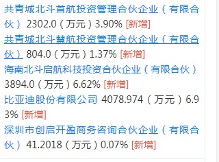 智通财经APP获悉, 天眼查App显示,10月15日,深圳华大北斗科技有限公司发生工商变更,新增比亚迪股份有限公司(01211)等5名投资人,注册资本从约5.65亿人民币增至约5.89亿人民币。股东信息显示,比亚迪股份出资4078.974万元,持股6.93%。