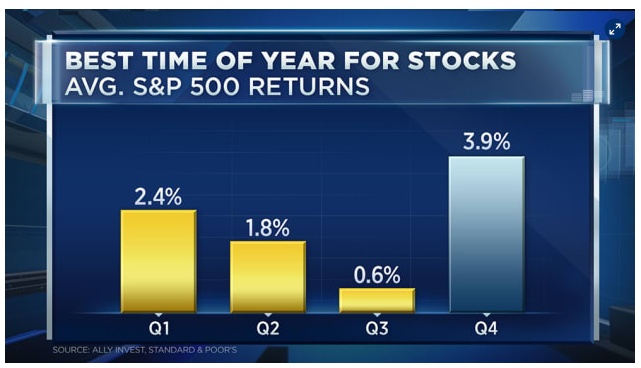 Bell指出,根据历史数据,标普500指数在第四季度的平均涨幅为3.9%,通常都是一年当中表现最好的季度,“一旦克服了市场上的一些不确定因素,我们仍然可以在第四季度保持良好的收益率。”