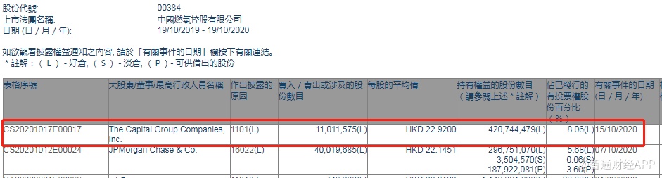 智通财经APP获悉,香港联交所最新资料显示,10月15日,美国资本集团增持中国燃气(00384)1101.16万股,每股作价22.92港元,总金额约为2.52亿港元。增持后最新持股数目约为4.21亿股,最新持股比例为8.06%。