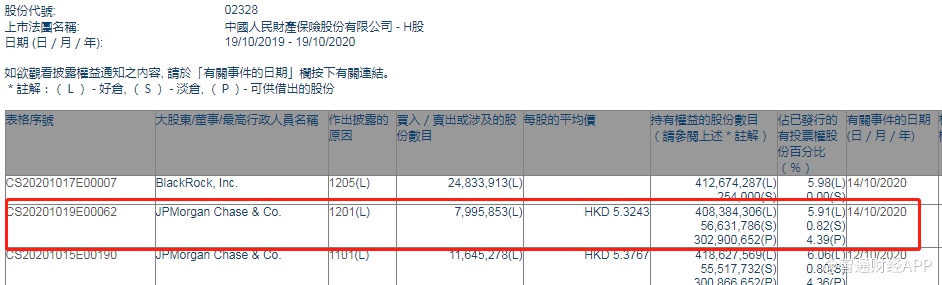 智通财经APP获悉,香港联交所最新资料显示,10月14日,摩根大通减持中国财险(02328)799.59万股,每股作价5.3243港元,总金额约为4257.26万港元。减持后最新持股数目约为4.08亿股,最新持股比例为5.91%。
