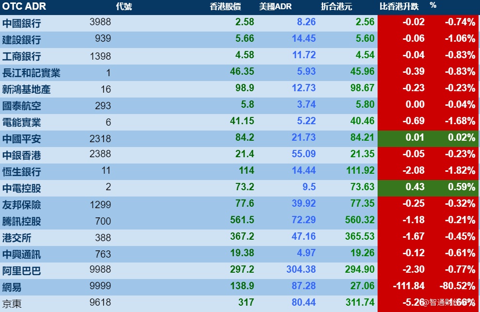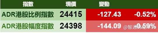 智通财经APP获悉,周一美股三大指数下跌,港股ADR指数下跌,按比例计算,收报24415点,跌127.43点或0.52%。