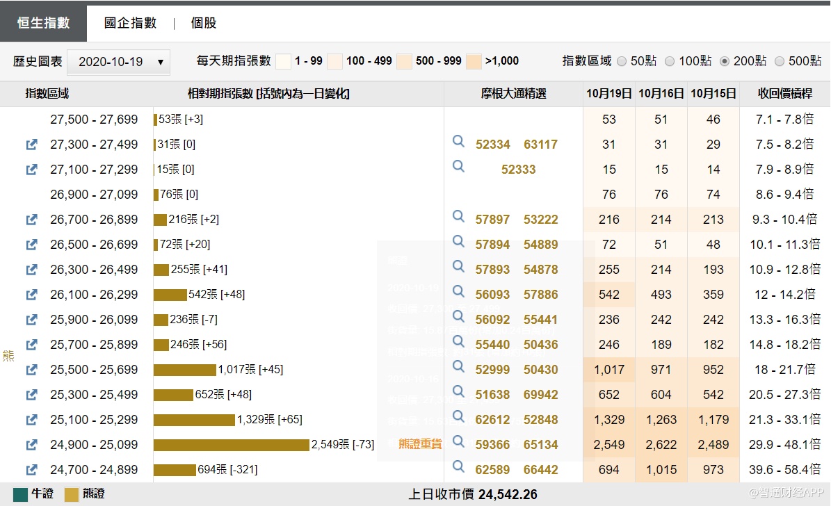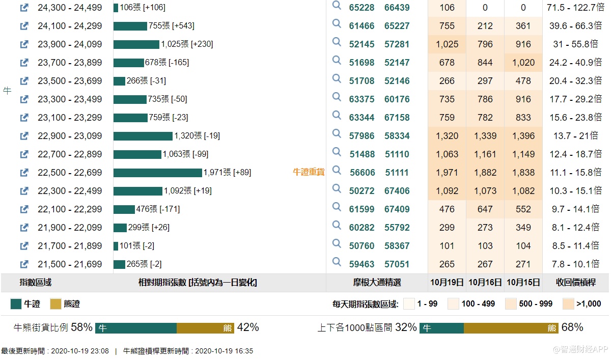 智通财经APP获悉,截至10月19日,恒指最新的牛熊街货比例58:42。摩根恒指牛熊证街货分布图中的数据显示,熊证街货重货区在24900-25099区间,该区间最新熊证数量为2549张,较上一交易日减少73张;最多新增在25100-25299区间,该区间最新熊证数量为1329张,较上一交易日增加65张。牛证街货重货区在22500-22699区间,该区间最新牛证数量为1971张,较上一交易日增加89张;最多新增在24100-24299区间,该区间最新牛证数量为755张,较上一交易日增加543张。
