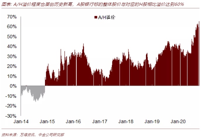 1) H股> A股,AH市场价差随银行行情呈现差异化表现,银行上涨阶段,A/H溢价收窄;银行调整阶段,A/H溢价扩大。目前A/H溢价率为60%~,处于历史极值状态。