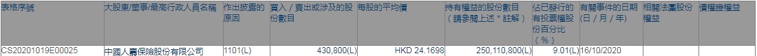 智通财经APP获悉,香港联交所最新资料显示,10月16日,中国人寿保险股份有限公司增持中国太保(02601)43.08万股,每股作价约24.17港元,总金额约为1041.24万港元。增持后最新持股数目约为2.50亿股,最新持股比例为9.01%。