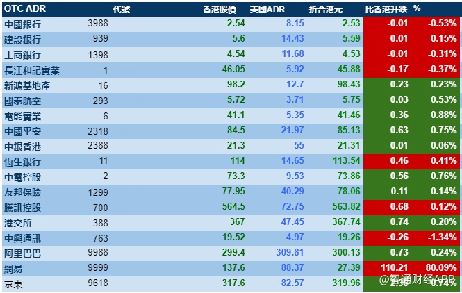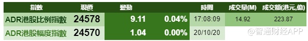 智通财经APP获悉,周二美股三大指数小幅上涨,港股ADR指数跟随上扬,按比例计算,收报24578点,涨9.11点或0.04%。