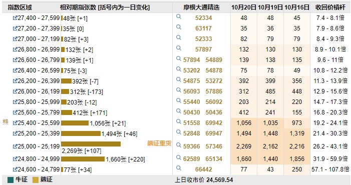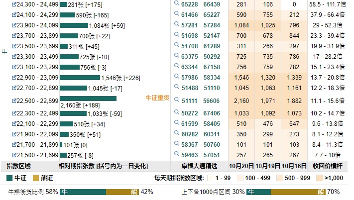 智通财经APP获悉,截至10月20日,恒指最新的牛熊街货比例58:42。摩根恒指牛熊证街货分布图中的数据显示,熊证街货重货区在25000-25199区间,该区间最新熊证数量为2269张,较上一交易日增加107张;最多新增在24800-24999区间,该区间最新熊证数量为1660张,较上一交易日增加220张。牛证街货重货区在22500-22699区间,该区间最新牛证数量为2160张,较上一交易日增加189张;最多新增在22900-23099区间,该区间最新牛证数量为1546张,较上一交易日增加226张。
