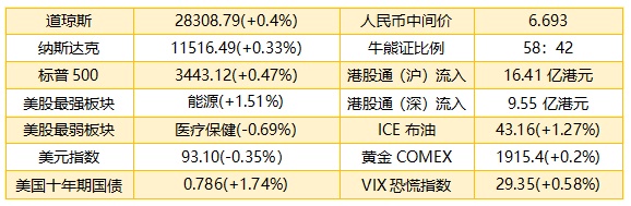 1、 美国众议院议长佩洛西周二表示,与财长努钦就新纾困方案的磋商取得一些进展。受利好憧憬刺激,华尔街股市周二盘中一度涨超1%。截至收盘,道指涨113.07点或0.40%,报28308.49点;纳指涨37.61点或0.33%,报11516.49点;标普500指数涨16.22点或0.47%,报3443.14点。港股ADR指数跟随上扬,按比例计算,收报24578点,涨9.11点或0.04%。
