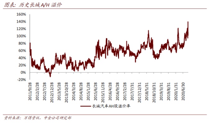 复盘历史,长城汽车(02333)A/H溢价率中枢高居70%左右,溢价率也达到100%的历史高位,长城H的平均NTMP/E长期在8倍左右,相比港股上市的一线自主品牌更低。我们认为海外投资者对长城长期存在SUV集中度过高、车型单一、核心技术研发能力的担忧,换而言之,担心“花无百日红”。而公司本轮的强产品周期,不仅是明星车款的换代,更有品类的拓展,公司抗风险能力进一步加强,逐步摘除港股的“估值帽”。