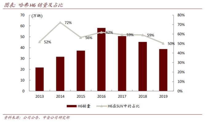 公司从2002年开始进入SUV市场,2010年SUV销量突破10万辆,2011年推出明星爆款紧凑型SUV车型H6,2013年开始独立打造哈弗品牌。在国内SUV红利的基础上,依托哈弗H6的强劲表现,2010年以来SUV销量实现了快速增长。在H6的基础上,公司不断推出新车型,形成了从H1到H9比较完善的哈弗H系列产品矩阵。但相对而言,H6销量占比仍然保持在较高水平,除2013年M4上市和2015年多款车型上市贡献增量外,2017年以前H6销量占比超过60%,是销量增长的核心驱动力。