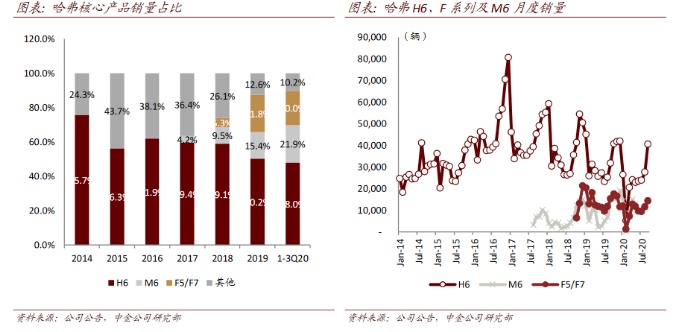 逐步探索,渐入佳境,实现差异化定位。从2018年开始,公司开始梳理哈弗品牌产品结构,精简同一产品的车型数量,并陆续推出了M6和F5/F7车型。从销量表现来看,M6和F系列车型逐步上量,月销均能够达到万辆的水平,同时H6月销仍然保持相对稳定,并没有形成内部竞争。我们认为得益于,M6精简配置,与H6的价格形成足够梯度;而F系列则通过更加年轻时尚的外观设计和配置的改变,做到与H系列定位不同客群。