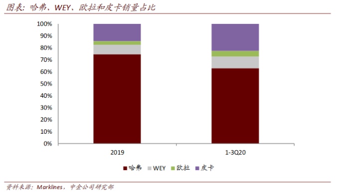 在哈弗SUV品牌外,伴随WEY、欧拉品牌以及皮卡炮车型的推出,公司已经形成了4大品牌。2020年前三季度,哈弗、WEY、欧拉和皮卡的销量占比分别为63%、10%、5%和23%,WEY、欧拉和皮卡销量占比均有所提升。