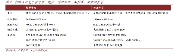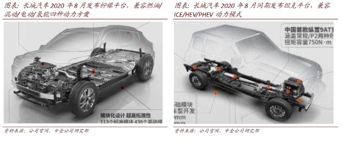 2018年以前,由于公司主要聚焦SUV车型,公司新能源车销量规模不大,以满足双积分要求为主。但公司在新能源领域多种技术路线的布局,以及三电技术(尤其是电池)的储备非常丰富,并于近两年进入新品发布高峰期。其中,公司主推的全新模块化平台——柠檬平台于2020年8月推出,能够兼容燃油、混动、纯电动和氢能四种动力模式。同期推出的坦克平台也能够生产PHEV版本产品。