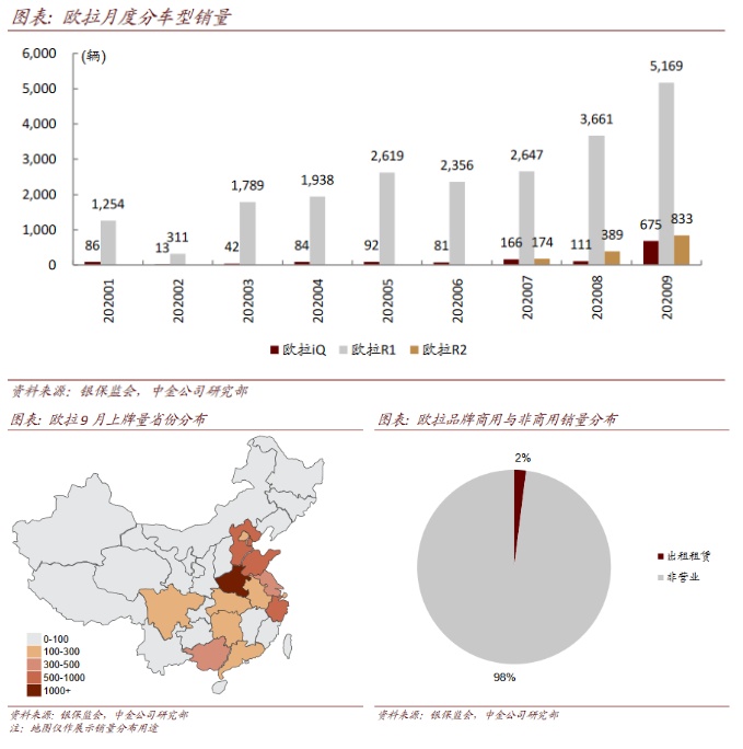 欧拉改款进一步上量,销售结构亮眼。欧拉是长城汽车通过100%正向研发打造的纯电动汽车品牌,第一款车型欧拉R1于2018年12月上市,后续扩充至R2、iQ两款车型,R1贡献主要销量,2019年欧拉品牌销量38,865辆,月销约3,200辆。今年7月R1改款黑猫上市,带动欧拉品牌在9月销量突破6,600辆。从销售结构来看,TO C需求为绝对主体,2020年1-9月占比超过95%。分地区看,非限购地区占比70%,销量排名靠前的省份既有河南、天津、河北、山东代步车大省,也有浙江、江苏、广东发达沿海地区,受众广泛。