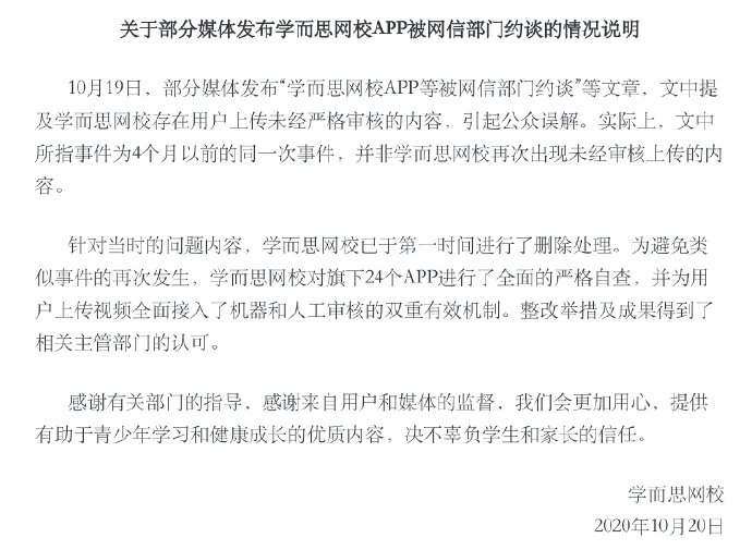 据悉,于10月19日,有媒体报道学而思网校”移动应用程序存在内容问题,北京网信办会同属地教育主管部门,依法约谈网站负责人,责令其限期整改,完善信息安全制度,加强内容审核,切实履行主体责任。