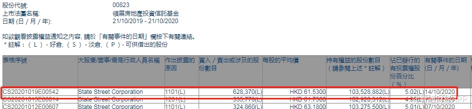 智通财经APP获悉,香港联交所最新资料显示,10月14日,State Street Corporation增持领展房产基金(00823)62.84万股,每股作价61.53港元,总金额约为3866.55万港元。增持后最新持股数目约为1.04亿股,最新持股比例为5.02%。