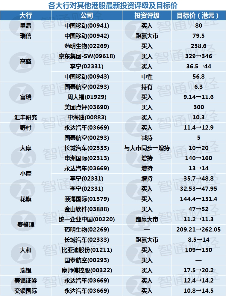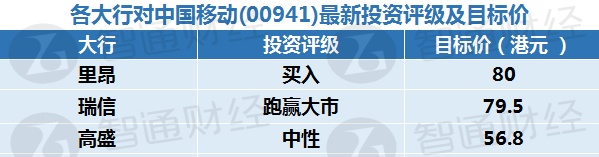 一、各大行对中国移动(00941)最新投资评级及目标价