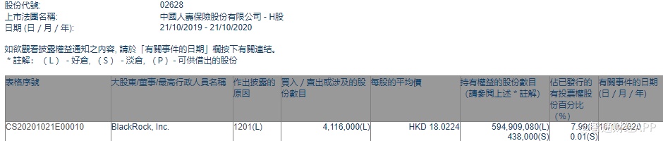 智通财经APP获悉,香港联交所最新资料显示,贝莱德减持中国人寿(02628)411.6万股,每股作价18.0224港元,总金额约为7418.02万港元。减持后最新持股数目约为5.95亿股,最新持股比例为7.99%。