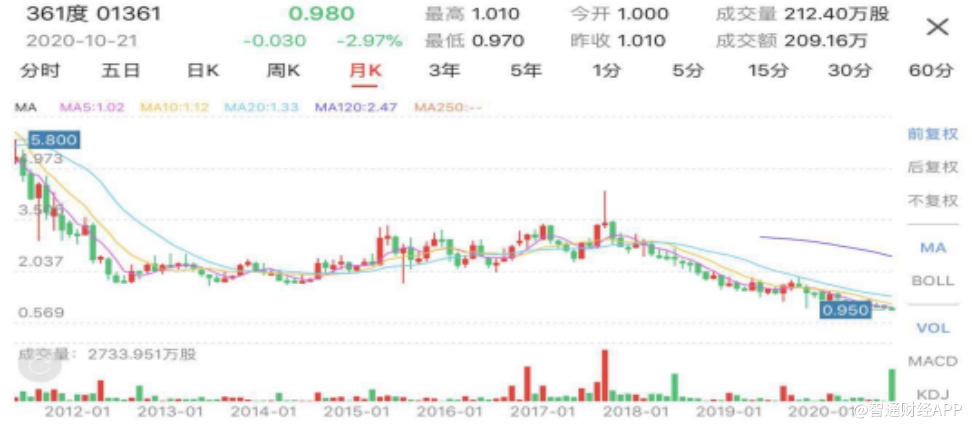 可以明显觉知,相较于国内主要友商,361度的经营复苏缺乏弹性。事实上,在过去几年间,361度就不时被打上“掉队”的标签,公司股价更是连续四年下挫,当前市值已不足巅峰时期六分之一。
