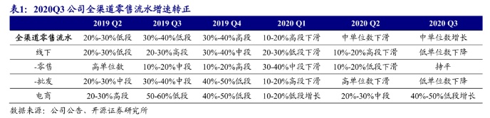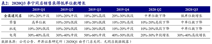 2)同店增长方面,2020Q3李宁同店销售录得低单位数增长,相较二季度中单位数下降显著改善。其中线下渠道方面,零售及批发渠道中单位数下降,相较二季度10%-20%高段下降大幅改善;电商渠道实现30%-40%高段增长,持续高速增长。