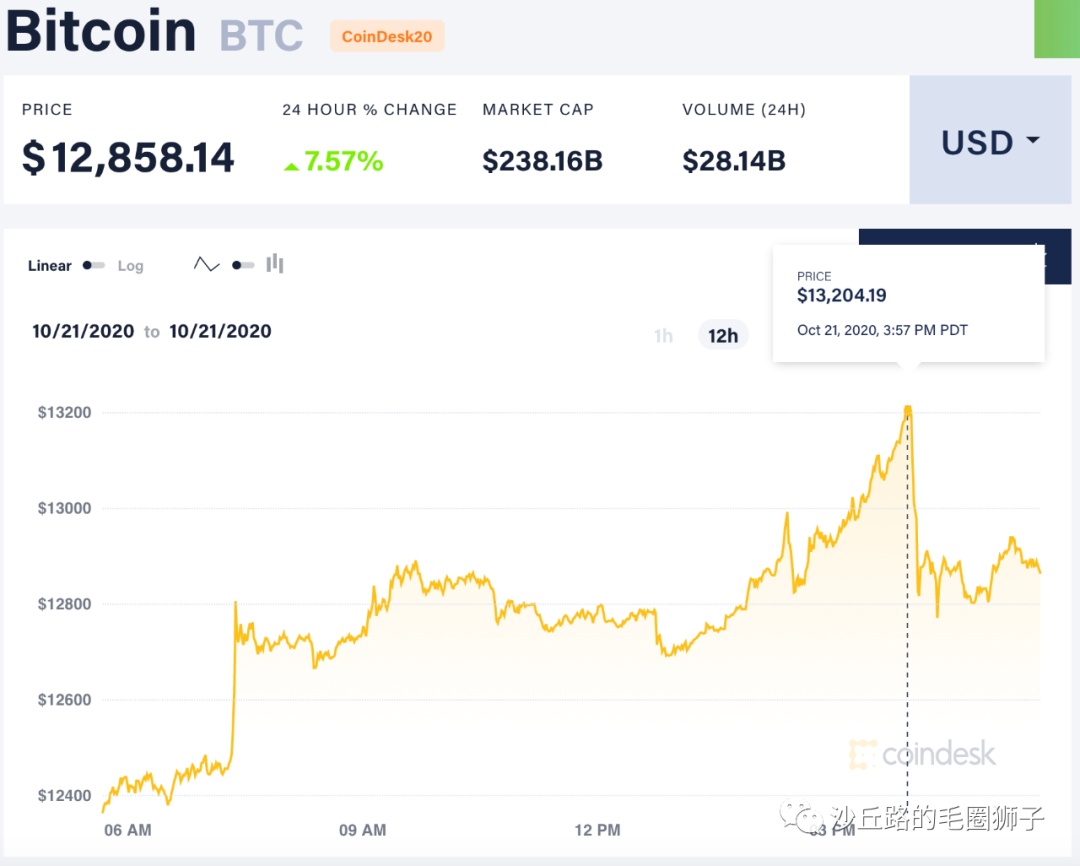 作为全球最大的国际支付网络之一,PayPal的背书也自然对资本市场产生了强大的刺激。比特币价格从一天之初的不到12,500美元跃升至近13,200美元。PayPal的股价也应声上涨了近6%,达到215美元以上。