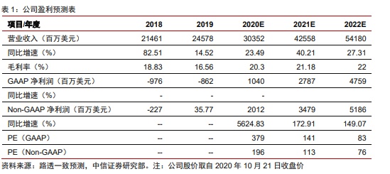 软件定义汽车时代,汽车有望成为最大的移动互联网空间。我们持续看好公司在电池、BMS、Autopilot 算法、智能驾驶数据积累的领跑优势。未来随着公司柏林&奥斯汀工厂产能的释放,Model Y&Cybertruck 的交付,公司产品销量有望进一步提升。根据路透一致预期,预计公司 2020/2021 年收入 303.5/425.6 亿美元,净利润(GAAP)、净利润(Non-GAAP)分别为 10.4/27.9、20.1/34.8 亿美元。