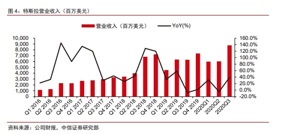 美国时间 10 月 21 日,特斯拉(TSLA.US)发布 2020Q3 季报。当季汽车产量 14.50 万辆(同比+51.0%,环比+76.3%),汽车交付量 13.96 万辆(同比+43.6%,环比+54.0%)。公司当季营收大幅超出市场预期,并连续实现五个季度的盈利:当季营收 87.71亿美元(同比+39.2%,环比+45.3%),大幅高于市场预期的 83.6 亿美元;净利润 3.31 亿美元(同比+131%,环比+218.3%),低于市场 3.94 亿美元的一致预期。软件定义汽车时代,智能汽车有望成为最大的移动互联网空间,我们持续看好公司在电池、BMS、Autopilot 算法、智能驾驶数据积累领域的领跑优势。