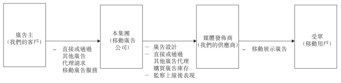 作为移动广告公司,辉煌明天目前主要提供两类服务:1.中介服务;2.精准广告服务。客户根据其广告需求从上游购买流量,通过公司提供的增值服务,实现营销内容更精准触达目标受众的“精准营销”推广效果。