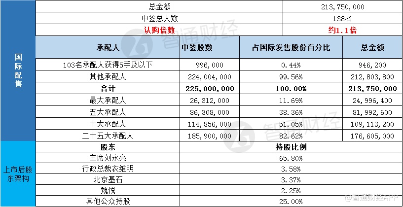 国际配售申购人数未披露,认购倍数约1.1倍。