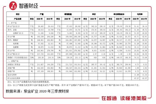 冶炼金及贸易金的营收贡献占大头,2020年首三季,该部分收入816.3 亿元,占总营收的 63.3%,但毛利率低,毛利润贡献也较低,矿山金和矿山铜收入分别为 99.4 亿元和 121.5 亿元,分别占总营收的 7.7%和 9.4%,虽然收入贡献低,但这两项业务毛利率高,贡献了核心的毛利润。