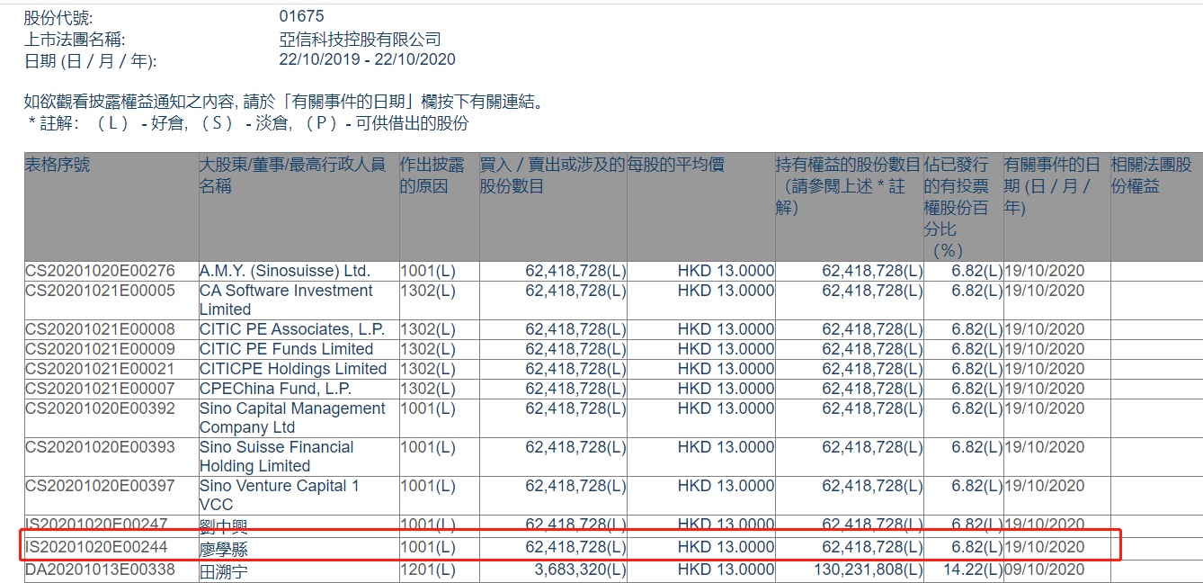智通财经APP获悉,香港联交所最新资料显示,10月19日,廖学县增持亚信科技(01675)约6241.87万股,每股作价13港元,总金额约为8.11亿港元。增持后最新持股数目约为6241.87万股,最新持股比例为6.82%。