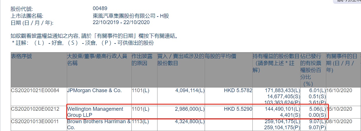 智通财经APP获悉,香港联交所最新资料显示,10月15日,Wellington Management Group LLP增持东风集团股份(00489)298.6万股,每股作价5.529港元,总金额约为1651万港元。增持后最新持股数目约为1.44亿股,最新持股比例为5.06%。