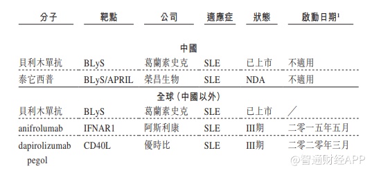 而在国内赛道,除了去年在国内上市的贝利木单抗外,还有5种用于治疗SLE生物药处于不同临床试验阶段。商业化角度来看,泰它西普处在国内第一梯队。