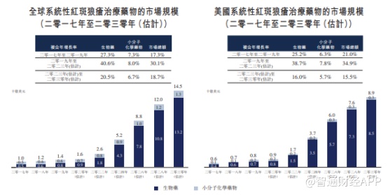 在全球范围内,系统性红斑狼疮治疗生物药市场需求广泛。从市场规模来看,其销售收益由2015年的约4亿美元增加至2019年的8亿美元,复合年增长率为22.1%。预期将进一步按复合年增长率29.3%增加至2030年的132亿美元。