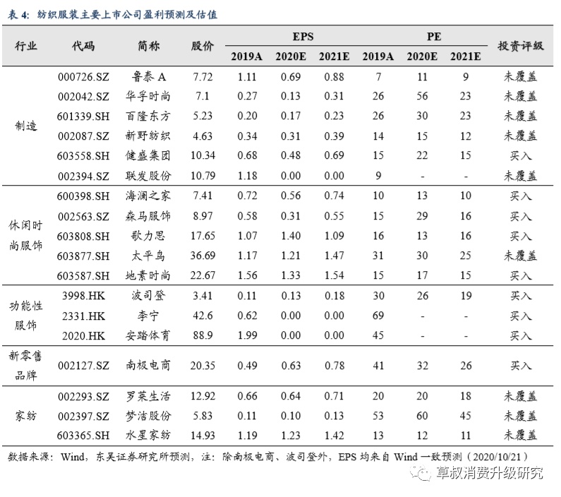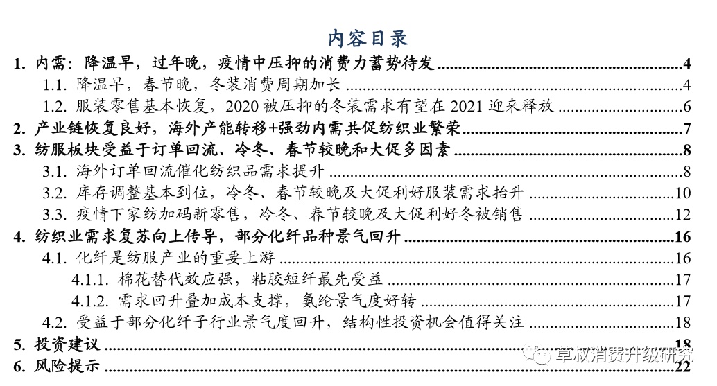投资建议:在主动库存去化的“内功”,以及冷冬、春节日期较晚、大促、海外订单回流的外功推动下,纺织制造、服装、家纺在Q4业绩均有望呈现较好表现。同时,纺服需求回升向上传导,带来上游粘胶短纤和氨纶景气度的提升。建议重点关注电商新零售服饰企业南极电商,功能性服饰龙头波司登;另建议关注粘胶短纤和氨纶子行业龙头三友化工和华峰氨纶等。