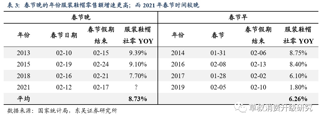 回顾往年,春节更晚的年份,1-2月服装卖的更好。我们以2月10日作为分界点,分成两个组别:①“春节早”组别:春节在2月10日之前,则春节假期通常在2月15日之前结束;②“春节晚”组别:春节在2月10日及之后,这种情况下春节假期通常在2月15日后结束,冬装消费期辐射到二月下旬。我们统计了2013-2019的春节日期及服装鞋帽针纺织类社零数据,其中“春节早”组1-2月增速为8.7%,较“春节晚”组高1.5pct。2021年春节日期为2月12日,属于“春节晚”组别,从往年经验来看,1-2月服装鞋帽针纺织类产品有望实现较高的销售额。