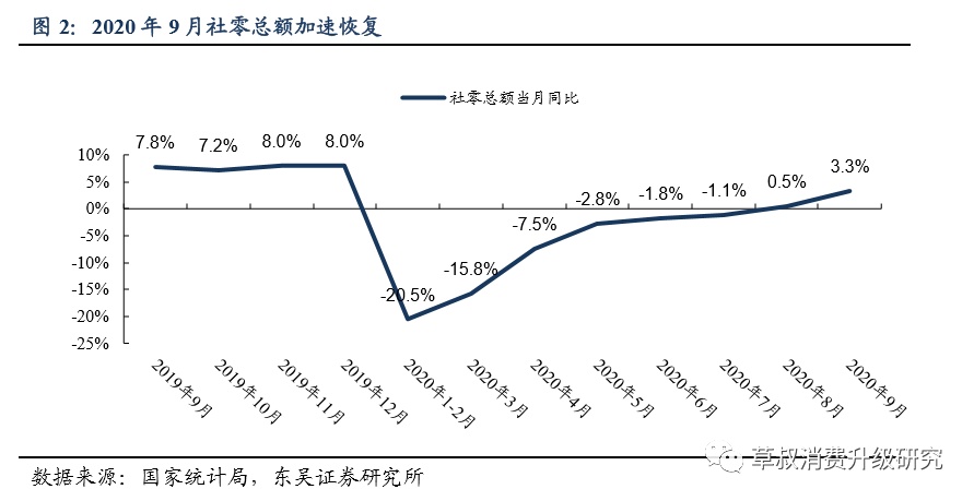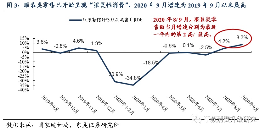 9月社会零售及服装鞋帽类零售额基本完成恢复。据国家统计局数据,2020年9月我国社会零售总额当月同比增速为3.3%;限额以上企业商品零售:服装鞋帽针纺织品类同比增速为8.3%。尽管社会零售总额的增速仍未恢复到公共卫生事件前的约8%水平,但已经实现3.3%同比增长,增速环比改善趋势明显;9月服装鞋帽类零售额当月同比增速是2019年9月以来的最高值,已经开始呈现“报复性消费”的苗头。