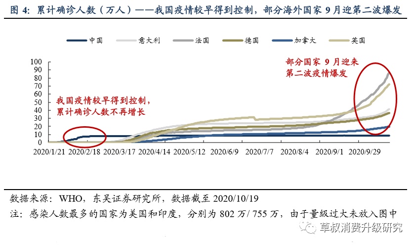 我国公共卫生事件于今年三月得到较好控制,工厂提前复工;但海外部分国家公共卫生事件9月迎来第二波爆发。公共卫生事件发生以来,我国迅速采取积极严格的抗议措施,国内公共卫生事件于三月中旬得到有效控制,体现在累计确诊人数不再增长。此后本土确诊病例基本没有增长,新增病例以输入型为主。而国外公共卫生事件形式仍不容乐观,据WHO,9月30日至10月18日,全球每日新增确诊病例从27万例/天加速至38万例/天,部分国家公共卫生事件于9月迎来第二轮爆发。
