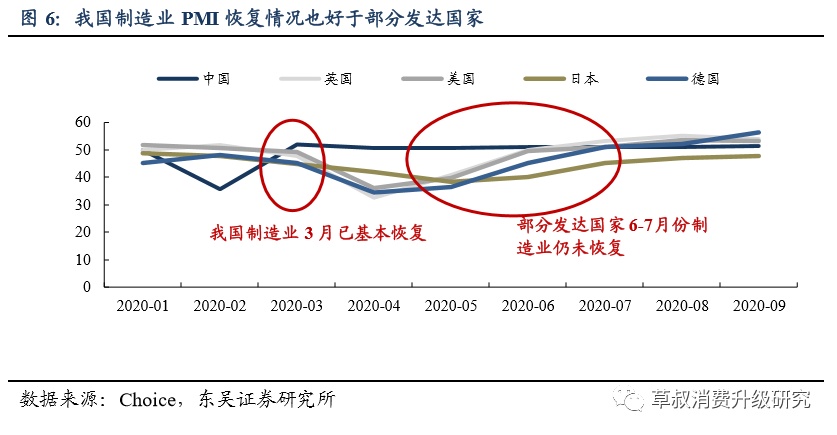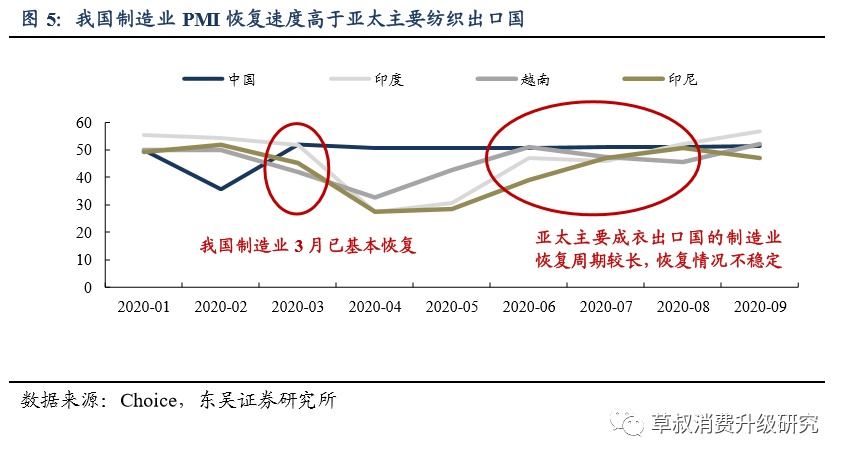 从PMI上看,公共卫生事件期间我国制造业恢复得更早、更稳定。我国制造业PMI仅在2月份受到一定影响:2月制造业PMI指数跌至35.7,但3月公共卫生事件初步控制后迅速恢复至 52,此后一直保持在荣枯线之上。印度、越南、印尼等亚太纺织出口大国的PMI恢复速度较慢,3月开始遭受打击之后,6-7月才开始恢复;而这些国家的PMI恢复情况也不太稳定,越南、印尼基本恢复后又多次跌落荣枯线之下。