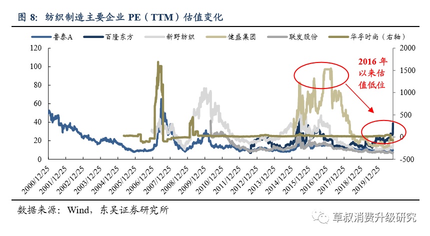 估值自2016年高位不断回落,目前处于相对低位。主要纺织制造上市公司估值自2016年高位不断回落,目前大多处于相对低位,估值具有一定吸引力。